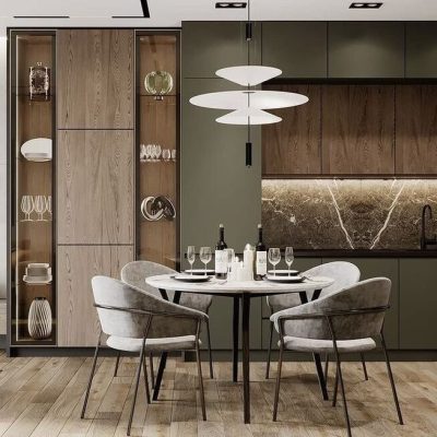 Luxury kitchens are a well-thought-out design solution: niches for built-in appliances, sink tables, lighting, convenient opening and storage mechanisms are provided. The furniture is equipped with hinged and roll-out drawers, compartments for dishes and cutlery, open shelves for placing spices and accessories. Often these are modular designs — the configuration and equipment is selected according to an individual order.
